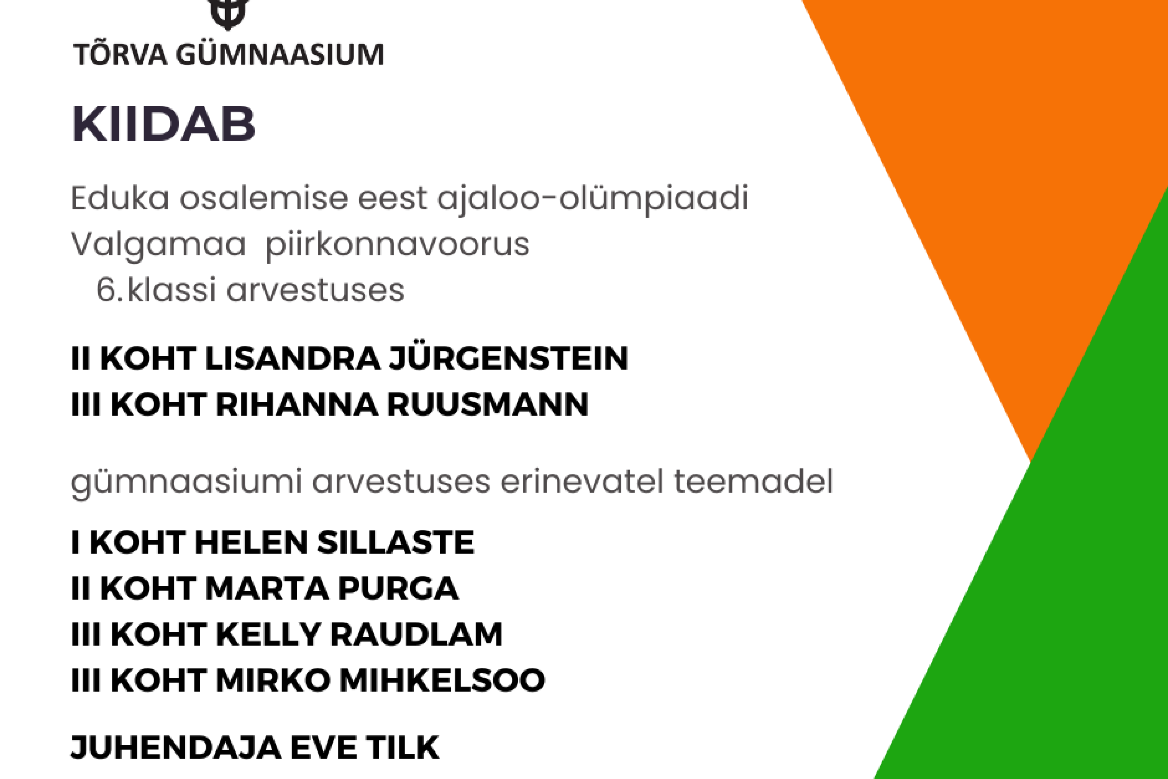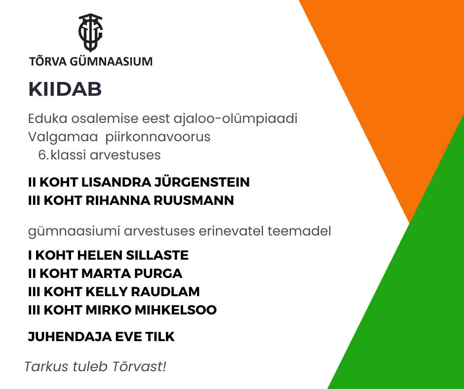 Noored näitasid TV10 Olümpiastarti sarja etapil häid tulemusi 💪 Loomise kuupäev 16.03.2026 Autor Tiivi Rüütel Kooli ajaleht Loomise kuupäev 09.03.2026 Autor Deivi Kivi 💻2026/2027 õppeaastast saavad 7.-12. klassi õpilased õppimiseks sülearvuti Loomise kuupäev 08.03.2026 Autor Tiivi Rüütel 🚶♂️➡️Liikusime jalgsi kooli ja koju Loomise kuupäev 02.03.2026 Autor Tiivi Rüütel Vaata rohkem