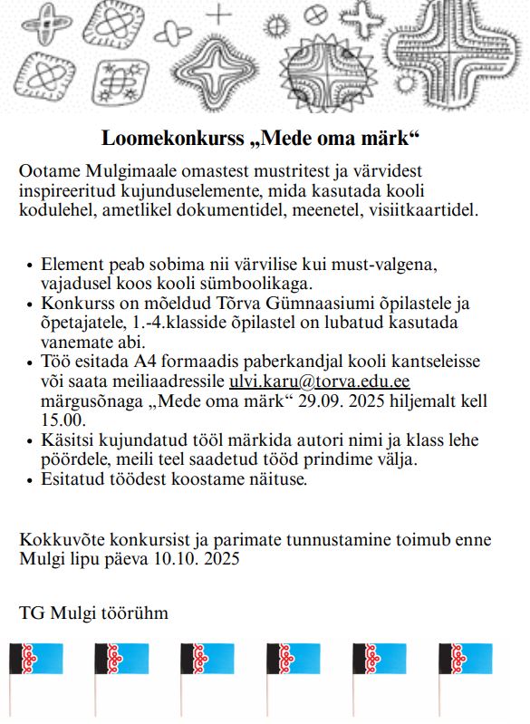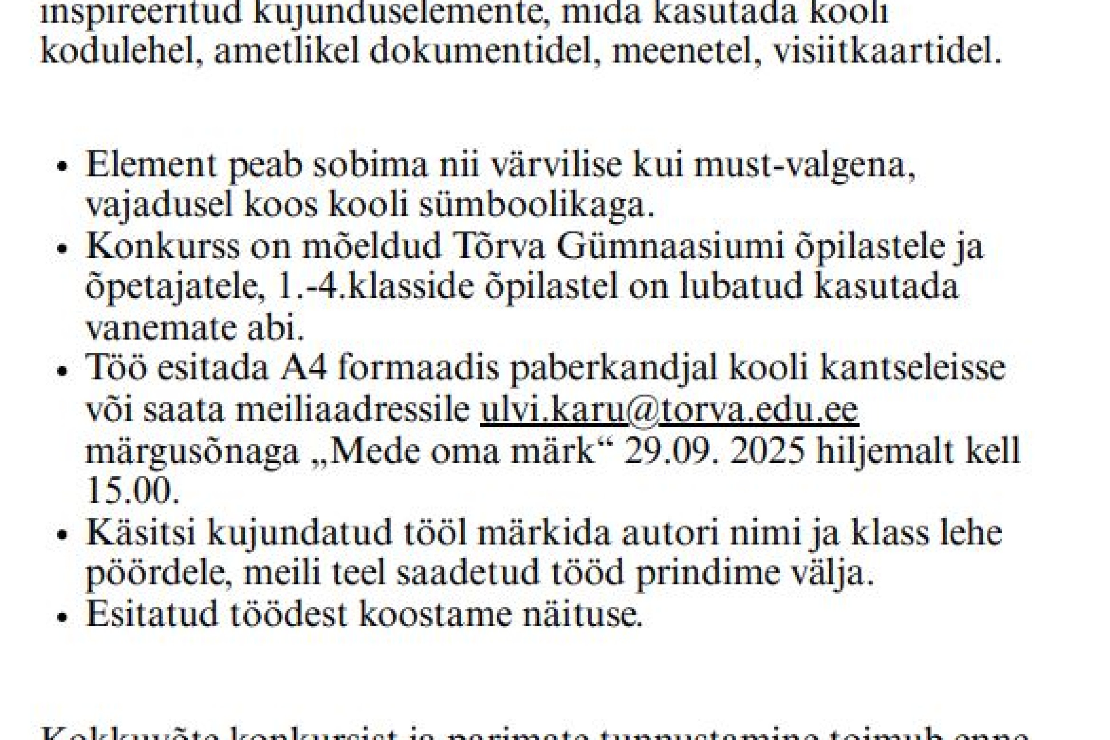 Töö esitada A4 formaadis paberkandjal kooli kantseleisse või saata meiliaadressile ulvi.karu@torva.edu.eelink opens on new page märgusõnaga „Mede oma märk“ 29.09. 2025 hiljemalt kell 15.00.
