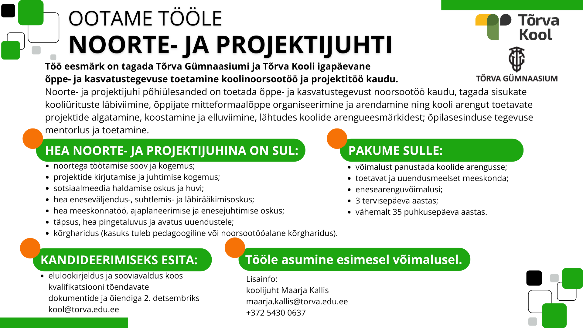 Kui tunned, et see kutsub Sind, või tead kedagi, kes meile Tõrva ideaalselt sobiks, anna julgelt märku!